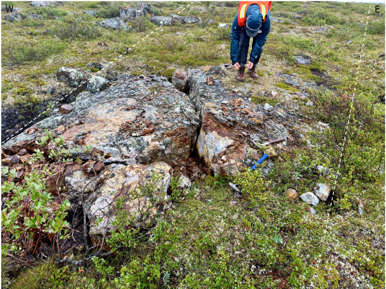 Rock sample location M209522 and NE trend outlined by white dashed lines towards NE and direction of further samples M209523-M209525. Sample M209522, taken from the outcrop pictured returned 3.8g/t Au & 761g/t Ag.