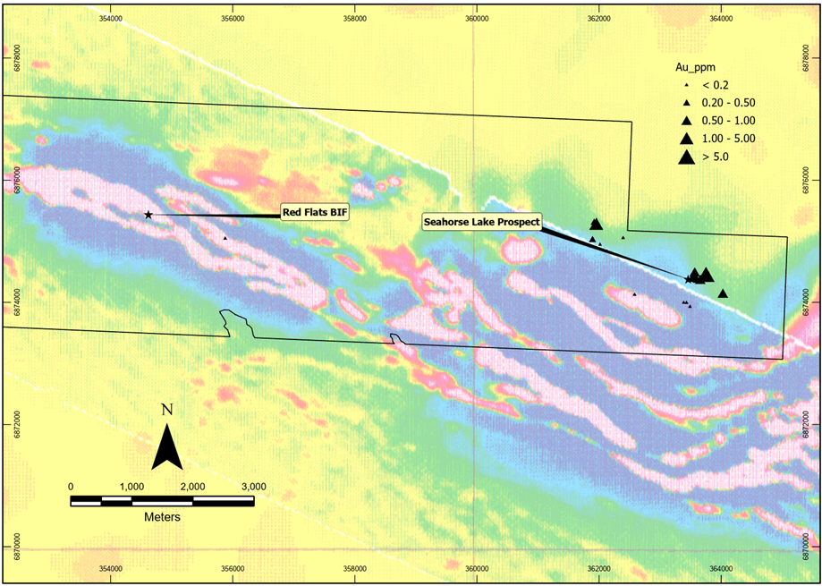 Omega prospective BIF’s seen as high magnetic response (pink & white colouring in low resolution aeromagnetic survey background image, vertical derivative)