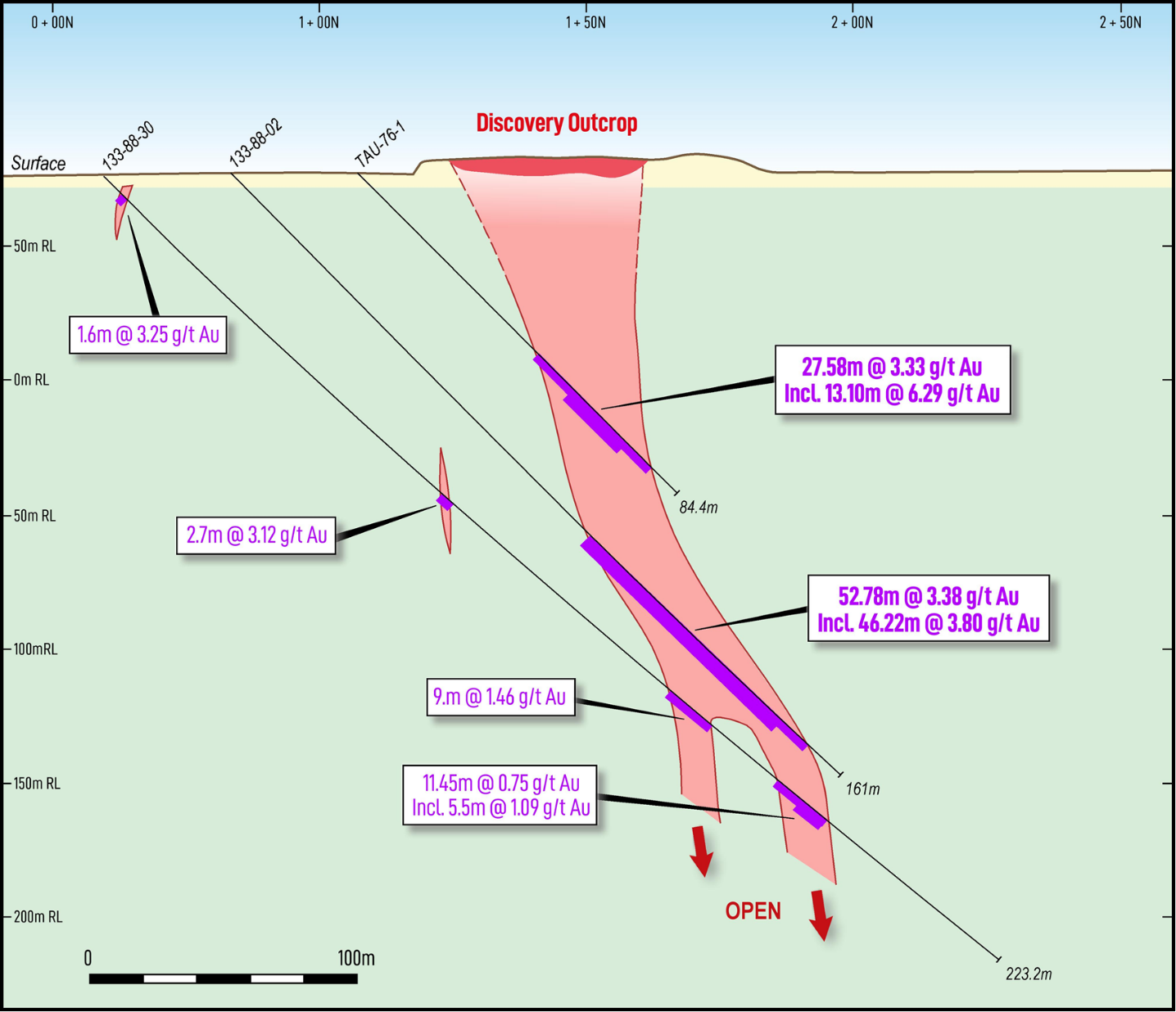 - 52.78m @ 3.38g/t Au from 89.22m, including 46.22m @ 3.80g/t Au from 89.78m