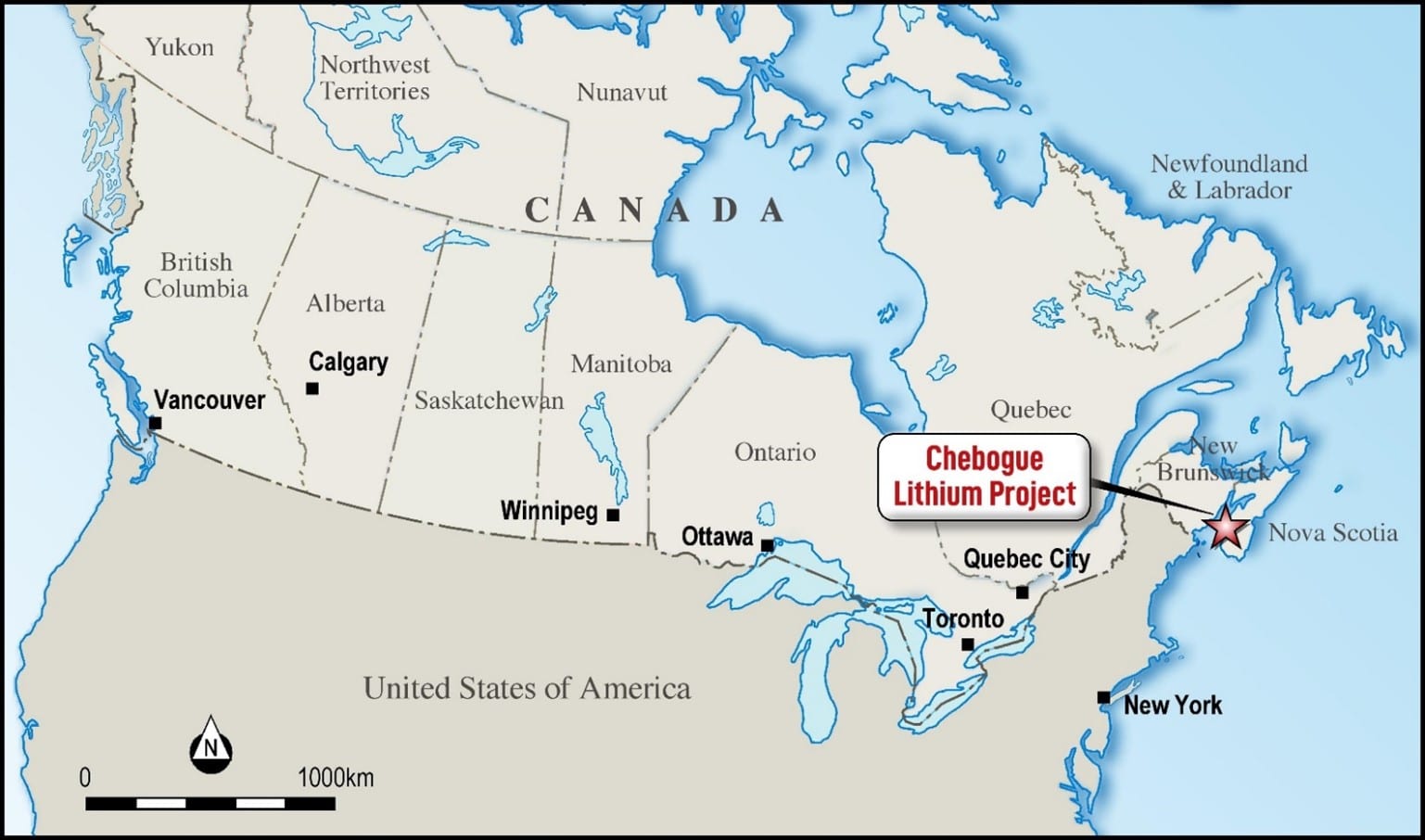 The L3 Project (formerly known as The Chebogue Lithium Project) covers approximately 1,200 km2 covers approximately 1,200 km2 in the emerging hard-rock lithium jurisdiction of Nova Scotia, Canada. The Project represents a significant opportunity for the Company to advance a lithium project that has the potential to host spodumene-bearing pegmatites. Historic exploration in the surrounding project area has mainly focused on gold, tin, base metals, and rarely on other critical metals. A regional review was carried out by the Nova Scotia Government in 2016 and identified several areas prospective for hosting lithium-bearing pegmatites. These areas extend as far eastward as Paradise and southward to Liverpool