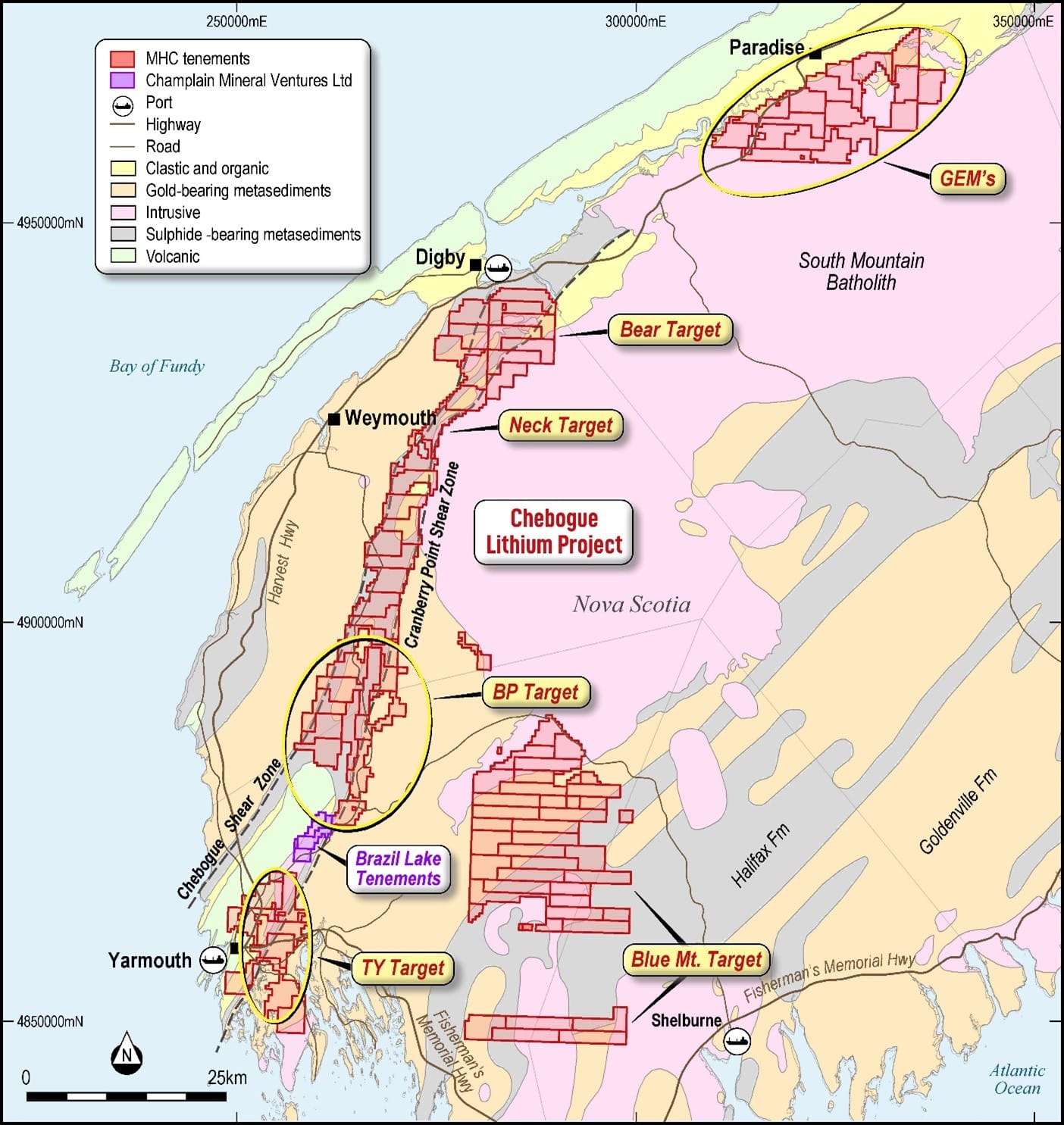 The only currently known lithium-bearing pegmatites in Nova Scotia are at Brazil Lake in Yarmouth County which lie within the Silurian White Rock Formation that forms a long, stratigraphic horizon from the town of Yarmouth, north-eastward to Digby and then eastward almost to Wolfville, a distance of approximately 230 kilometres. MHC will acquire a >100km stretch of this belt which includes both the Chebogue and Paradise project areas. Both zones are known to host coarse grained pegmatites, including the Brazil Lake deposit, in association with volcanic/sedimentary lithologies and the voluminous, peraluminous South Mountain Batholith.