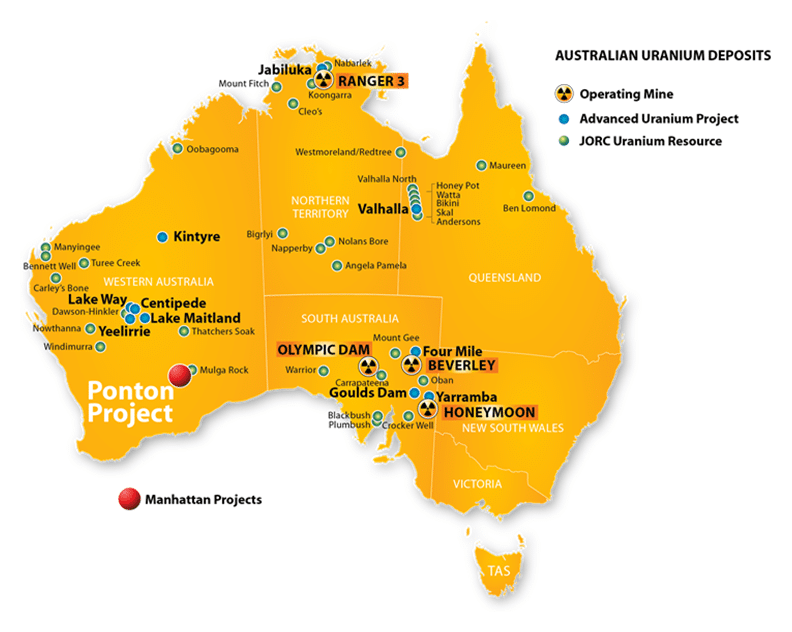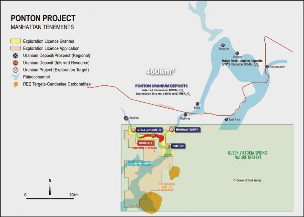 On 23 January 2017 Manhattan reported an upgraded JORC Code 2012 Inferred Resource for the Double 8 uranium deposit at Ponton in WA of 26 million tonnes (Mt), for 17.2 million pounds (Mlb) grading 300ppm uranium oxide (U3O8) at a 200ppm cutoff.